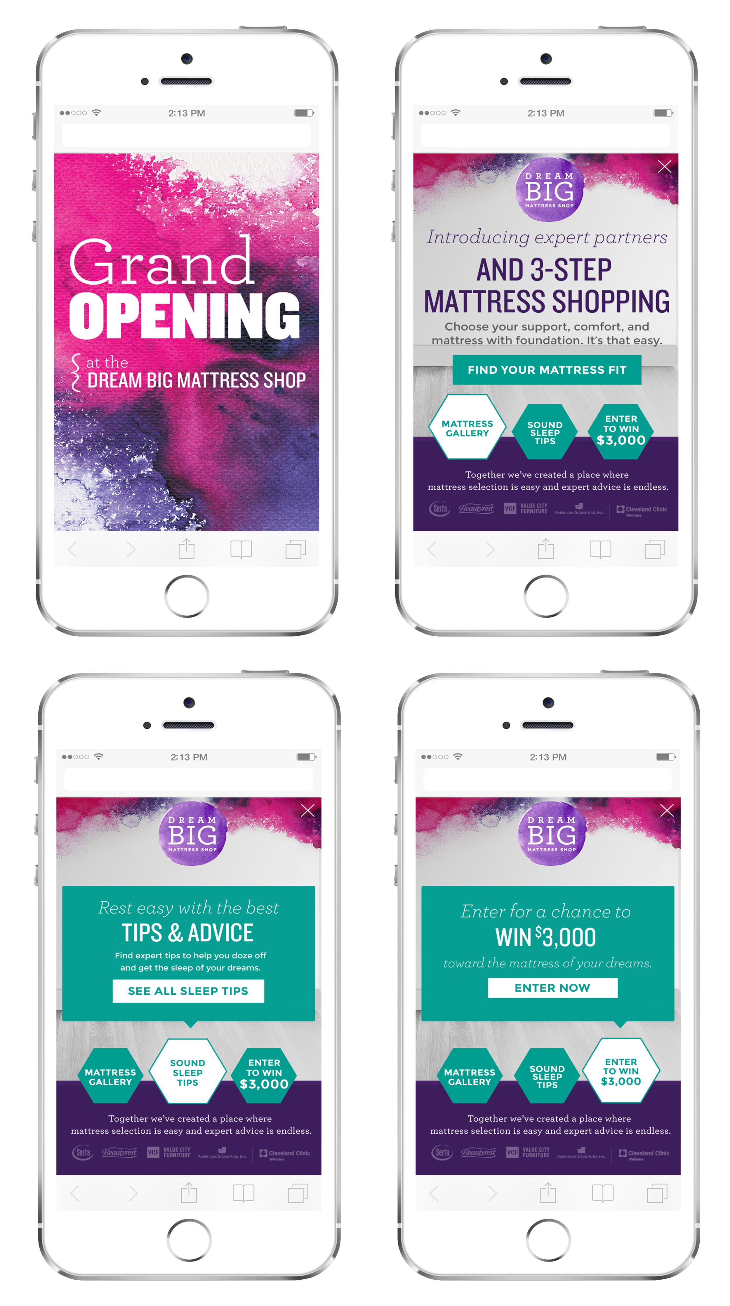 As a designer, I developed an interactive ad for Dream Big Mattresses, designed for multiple screen formats and user engagement through clickable points at the bottom, and a carousel to cycle through the different products. The concept allowed users to explore product features and offers through an intuitive, multi-layered experience. Despite a fast turnaround, I delivered a fully functional, on-brand ad that maintained both visual quality and technical performance across devices.
